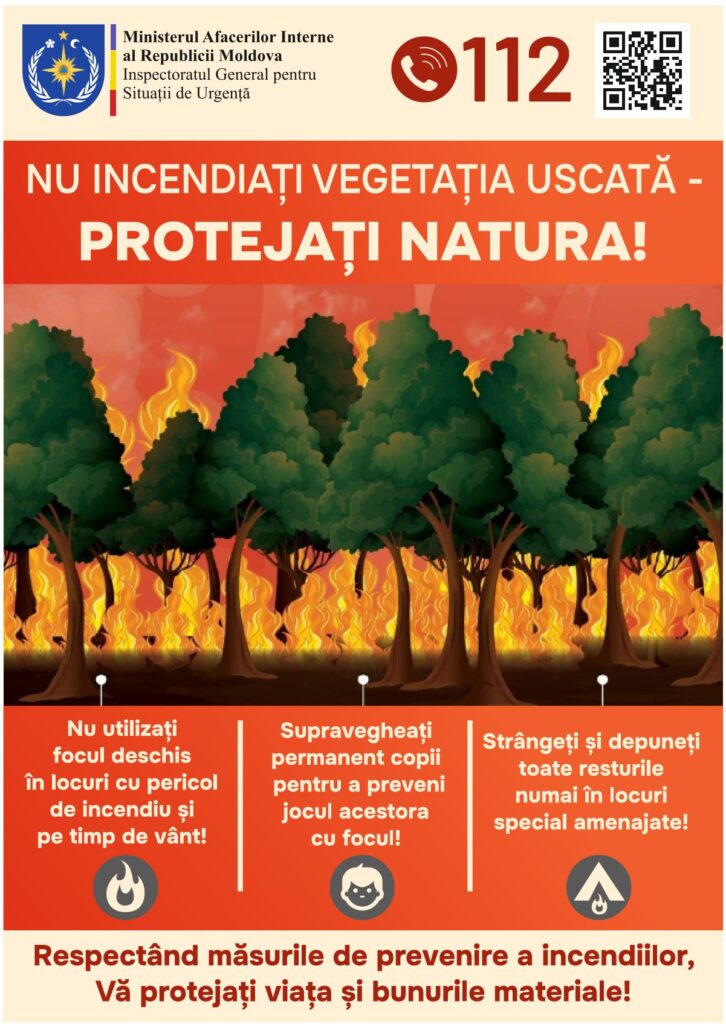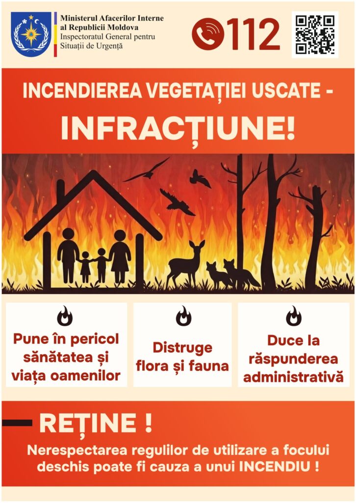 🔥 Inspectoratul General pentru Situații de Urgență informează cetățenii despre riscurile majore ale arderii vegetației uscate. Aceste acțiuni pot provoca incendii necontrolate, punând în pericol vieți omenești, locuințe și mediul înconjurător.