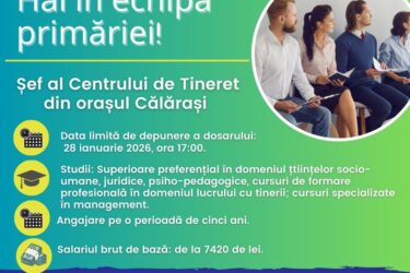 ❗Hai în echipa Primăriei 🏃♂️🏃♀️🏃 ❗Căutăm Șef al Centrului de Tineret din Călărași❗ 👉Salariul brut de bază începe de la 7420 lei 👉Înscrie-te până pe 28 ianuarie 2026, ora 17:00 Dispoziție Nr.8 din 09.01.2026 Anunț Cu privire la inițierea concursului