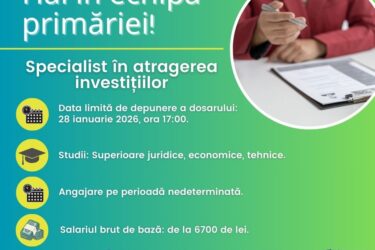 Hai în echipa Primăriei Căutăm specialist în atragerea investițiilor Salariul brut începe de la 6700 lei; Înscrie-te până pe 28 ianuarie 2026, ora 17:00. Dispoziție Nr.7 din 09.01.2026 Anunț cu privire la inițierea concursului privind ocuparea funcției publice vacante de specialist în atragerea investițiilor
