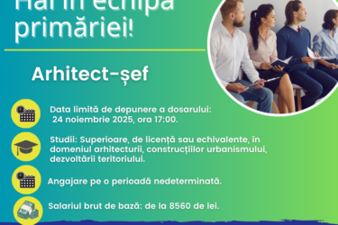 ❗Hai în echipa Primăriei 🏃♂️🏃♀️🏃 ❗Căutăm Arhitect – Șef❗ 👉Salariul brut de bază începe de la 8560 lei 👉Înscrie-te până pe 24 noiembrie 2025, ora 17:00 Dispoziție Nr.330 din 03.11.2025 Anunț Cu privire la inițierea concursului