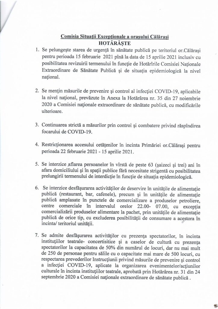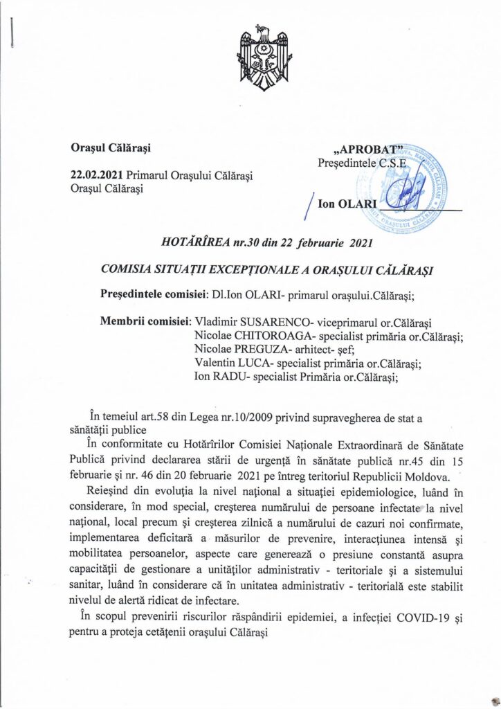 Hotărârea Nr.30 din 22 februarie 2021 a Comisiei Situații Excepționale a orașului Călărași!